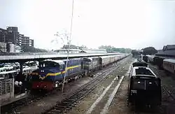 Two diesel locomotives pull a passenger train into Dar es Salaam's main railway station. | |