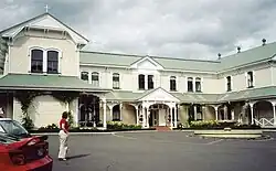 Mission Estate Winery, founded in 1851 and occupying its present site in Church Road since 1897, is the oldest New Zealand winery still in operation[15][16][17] and is a tourist attraction. French Marist missionaries established the Hawke's Bay Marist Mission at Pākōwhai in 1851. The mission was moved to Meeanee in 1858 and a vineyard was established to produce sacramental and table wines, and a church and school were built soon after. In 1880 a two-storied house was built as a seminary. Following the 1887 flood, an 800-acre (325 hectares) property in Church Road was purchased from Henry Tiffen and a new vineyard was established. Some of the original terracing can be seen on the hillside area now used for the Mission Concert held every February. In 1910 the Mount St. Mary Seminary building was moved from Meeanee to its present Mission location on Church Road. It was cut into eleven sections and rolled on logs towed by a traction engine, an operation that took two days. An accommodation block was built and opened in February 1931. The next day the Hawke's Bay earthquake struck, causing serious damage to the entire Mission. Two priests and seven students were killed when the stone chapel was destroyed.[7] The seminary building was refurbished in the early 2000s to accommodate a restaurant and function rooms.[18] The Mission is a popular venue for weddings.