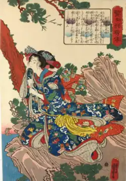 According to a version of the legend of Matsura Sayohime, she prayed with such fervour that she was transformed into stone.[9] This petrification lore of Sayohime appears to be of later development, with its earliest attestation identified as renga poet Bontōan's Sodeshita shū (c. Ōei era, late 14th to early 15th century).[10] This lore of Sayohime's petrification is thought to have developed from a misunderstanding: a misreading of Jikkinshō (13th century), which ponders on the Sayohime legend and makes reference to the petrification motif taken from an old Chinese work called the Youminglu.[11][12] Sayohime's petrification is also mentioned in Nihon meijo monogatari (1670).[13]