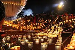 The hot air balloon competition goes on all day long and until late at night, providing an opportunity for various villages and families from the surrounding region to exhibit their homemade hot air balloon creations.[8] In the daytime, the show is focused on the children, featuring large balloons fashioned into animal shapes, ranging from birds to tigers and elephants. The sky is filled with hot-air balloons, mostly representing traditional Myanmar and cartoon figures, popular among kids and adults.[6][7][9] In the evening, the festival comes alive with the exciting main hot-air balloon competition. These balloons are decorated with hundreds of candles and fireworks attached at the bottom are lighted once they fly into the sky.[3][6]