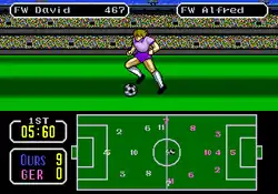 Tecmo Cup Football Game is a radical departure from traditional soccer simulators; the game resembles an RPG more than anything. The player runs around the field normally, navigating by means of a miniature overhead view of the field located at the bottom of the screen, on which they are represented by the number they occupy on the team. The player in possession of the ball is seen as a tiny football.