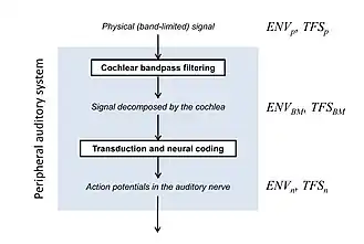 Both ENVBM and TFSBM are represented in the time patterns of action potentials in the auditory nerve[11] these are denoted ENVn and TFSn. TFSn is represented most prominently in neurons tuned to low frequencies, while ENVn is represented most prominently in neurons tuned to high (audio) frequencies.[11][12] For a broadband signal, it is not possible to manipulate TFSp without affecting ENVBM and ENVn, and it is not possible to manipulate ENVp without affecting TFSBM and TFSn.[13][14]