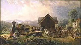 Edward Lamson Henry, a noted genre painter, was deeply interested in transportation.[2] This interest included trains, a key part of 19th century America's infrastructure. As noted by the Met's description of the work, the model of train station depicted in the 1867 painting was widely produced, rendering the exact station hard to identify.[2] Per the museum, Henry may have also used elements from multiple stations in his depiction of a bustling station.[2]