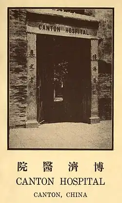The Canton Hospital is one of the most influential missionary hospitals in South China. Not only was it the first hospital that brought the concept of public health to the city of Canton, but it is also sustainable, as it still exists today as one of the most prestigious ophthalmic institutes in the world. Throughout its time open, the hospital set many records in Chinese medical history, including being the first western medicine school in China, and producing the first Chinese medicine magazine and the first x-ray film.[9] It also produced the hospital's best student, Sun Yat Sen, who became the first president of China.[10][11] In addition, the Canton Hospital gave explicit expression to the concept of medical missions for the first time. In 1838, it led to the creation of the Medical Missionary Society in China, a Protestant medical missionary society established in Canton, which was dedicated to promoting religious missions and gaining the trust of the Chinese through medical care, instead of through preaching. In 1898, Parker’s successor, John Glasgow Kerr, founded The Asylum for the Insane in Canton, which was the first institution in China dedicated to the mentally ill.[12] This was a direct result of the hospital’s success, and shows the impact that it had on public health and medicine in China.