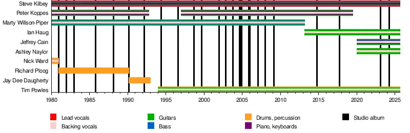 The founding members were Steve Kilbey on lead vocals and bass guitar, Peter Koppes and Marty Willson-Piper on guitars, and Nick Ward on drums. Ward played only on their debut album, and the band's drummer for the rest of the 1980s was Richard Ploog. Jay Dee Daugherty (ex-Patti Smith Group) played drums from 1990 to 1993, followed by "timEbandit" Tim Powles (ex-The Venetians), who remains with them to the present day. Koppes left the band from 1992 to 1997,[4] and Willson-Piper left in 2013. Ian Haug, formerly of Powderfinger, replaced him. Kilbey, Koppes, and Powles also recorded together as the Refo:mation in 1997.