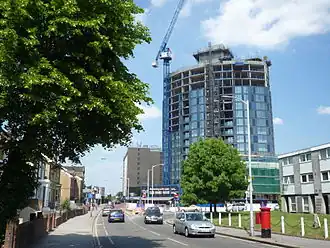 Construction began in 2007, and halted in 2009 when the projects funding source HBOS went into administration.[6] It restarted in late 2010 but officially stopped in June 2011, following the construction company, St James's Croydon, a subsidiary of developers Phoenix Logistics entering administration.[7] By March 2012 the site was showing increasing signs of vandalism and graffiti and on 22 April 2012 the construction crane was removed from the site. In November 2012, a number of the apartments which had been fitted with the exterior glass still displayed 'Sold' signs (which date back to when the building was still under construction and being marketed), and a number on the lower floors were left with timber or plastic coverings. The lower floors of the building and the hoardings around the site were daubed with graffiti.
