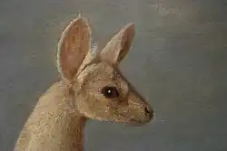 The Kongouro from New Holland is an oil painting by George Stubbs. Depicting a kangaroo, it is the first painting of an Australian animal in Western art, along with a painting of a dingo—Portrait of a Large Dog—also by George Stubbs. It is part of the collection of the National Maritime Museum in Greenwich, London.[1] The work was commissioned by Joseph Banks and based on the inflated skin of an animal he had collected from the east coast of Australia in 1770 during Lieutenant James Cook's first voyage of discovery.[2] It also seems to be based on Sydney Parkinson's drawing of a kangaroo; Parkinson was Joseph Banks's botanical illustrator on the first voyage of James Cook. It depicts the animal sitting on a rock and looking over its shoulder with a backdrop of trees and mountains. The two were the only two paintings that Stubbs did not draw from a live subject.[2]