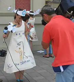 One Solidarity Sister explains: "We have appeared in these costumes a couple of times in Nottingham and in Sheffield. We dress in little white dresses, with one of us in lederhosen and hats and bags. It's about showing solidarity. It's more a sort of universal image. On the bands and the skirts there's lots of images of people holding hands. It's about spreading equality, friendship and acceptance. We look a little bit like aid nurses. Like it's about having a helping hand. Being there to support people. The dresses were made from reclaimed fabrics. They were used for car seat padding. It's good to be reusing stuff."[18]