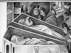 Artist Ben Shahn had always wanted to be alive during a time of greatness, such as the crucifixion of Christ.[1] Seeing the public reaction to and honoring of Sacco and Vanzetti's lives, Shahn came to see the event as a "crucifixion" of his own time. He participated in a picket against the execution and grew more convinced of their innocence over time.[2]