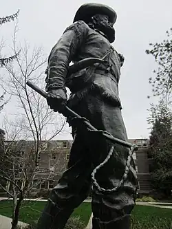 In a 1928 newspaper article, the statue was described as standing "in the center of the campus", and depicting "the pioneer spirit of the West".[12] In 1929, the statue was guarded against vandalism, along with other Eugene landmarks, prior to the homecoming football game rivalry with Oregon State University.[13] An editorial in the Eugene Guard in 1931 mentioned, in the context of the in-state rivalry: "Orange paint of the hue so popular in the vicinity of Corvallis daubs the pavements at the University, the big 'O' on Skinner's Butte, even the famous Pioneer statue."[14]