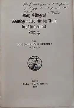 - ^ Paul Schumann: Max Klingers Wandgemälde für die Aula der Universität Leipzig, Leipzig 1909.