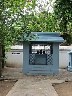 The Valluvar shrine is located within the Ekambareswarar temple complex in a narrow lane adjacent to the Valluvar statue on Royapettah High Road,[21] off Mundagakanni Amman Koil street and behind the Thanithorai market in Mylapore.[2] Situated on a 25-ground plot,[14] the temple complex has exclusive sanctums for various deities, namely, Ganesha, Subramanya, Shiva (Ekambaranathar shiva linga) and Parvathi (Kamakshi), Thiruvalluvar and his consort Vasuki,[2] Durga, the Navagrahas, and goddess Karumariamman (an incarnation of goddess Parvathi).[10][12][17] On a traditional clockwise circumambulatory trip around the temple corridor, the shrines of Shiva and Parvathi appear along with Ganesha and Subramanya, followed by the sanctums of Karumariamman and nagakkal (carved stone slabs depicting holy snakes) representing Nagaraja beneath a holy neem tree (Azadirachta indica) at the southwestern corner of the temple complex.[2][10] The lintel of the main shrine of Ekambaranathar bears the stucco idols of Valluvar worshiping Shiva and Parvathi. The palli arai, or the divine bedchamber, lies behind the Shiva shrine, where the processional deities are symbolically laid to rest for the day.[2]