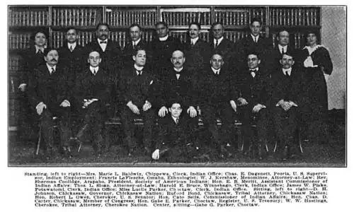 Sloan was one of the founding members of the Society of American Indians.[1] He served as a member of its executive council and was its first vice president.[7] Later, however, Sloan stepped down from his position as vice president in part due to some rumors about his past.[10] Sloan was eventually named president of the organization, winning over Charles Eastman and Captain Raymond Bonin for the seat.[3] Sloan was the Editor-in-chief of American Indian Magazine, and he supervised other well-known editors such as Clark Wissler, Frederick W. Hodge, and others.[3][7] During WWI and after, Sloan and the other editors used the journal to advocate for Native American law reform and citizenship, similar to the ideas he had shared in the previously mentioned "Talks and Thoughts".[5] In addition, they also worked alongside African American Peers like W.E.B DuBois in debates about racial uplift. Although Sloan and the other editors had high expectations for the journal, it would publish its last issue in August 1920.[12][10]