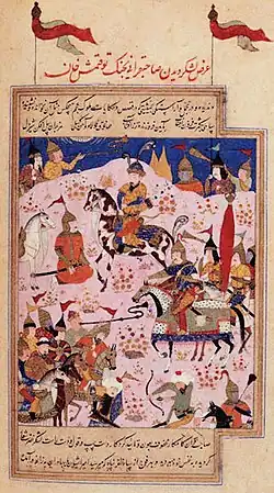 The Golden Horde was a fragment of the Mongol Empire mainly located in Eastern Europe.[33][34] After the death of Jochi, the eldest son of Genghis Khan and khan of the Golden Horde, the Golden Horde itself divided into many wings with mainly White and Blue wings among Jochi's descendants.[35][36] In the late 1370s and early 1380s, Timur firstly helped Tokhtamysh against his uncle Urus Khan to assume supreme power in the White wing and then in the unification of the Golden Horde.[29] Timur also supported him in the siege of Moscow in 1382 and received tribute from Muscovy.[29]
