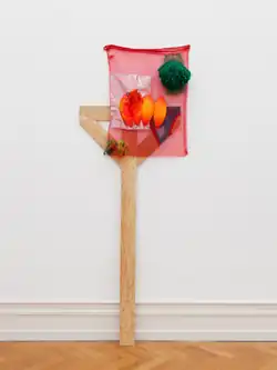 Working within the "problems of abstraction"[2] the artist often takes up a class-conscious cultural criticism through the genre of the funerary as well as processes derived from psychic automatism. Utilizing abstract compositional constructions and modest sculptural materials, such as concrete blocks, folding chairs, and cereal boxes, the works bear witness to the condition of the inevitable. Anne Doran writes, Holmes's work is "redolent of institutional limbos and marginal lives, with shrill bottom notes of failure and fear."[3]