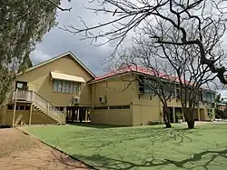 The building constructed on the new site in 1910 was a standard design (Type C/T2) by the Department of Public Works, which retained responsibility for schools until 2013. Under the Department's stewardship, and through the involvement of some of Queensland's most innovative architects, school buildings became more advanced and diverse. A period of marked experimentation in school design occurred between 1893 and 1914, with a primary focus on improving the natural light and ventilation of classroom interiors.[19] Various combinations of roof ventilators and ducting; ceiling and wall vents; and larger windows of varying sill heights and dormer windows were trialled. For timber-framed buildings, single-skin construction was favoured for its heat dissipation ability and economy. Often the building was lined on the interior rather than exterior, providing a smooth, cleanable surface that provided better interior light. The resulting externally-exposed stud framing was protected from the weather by wide verandahs, which had the added benefit of shading the building and providing makeshift teaching space. The introduction of highset buildings began in the late 1890s, providing better ventilation and additional teaching and covered play space underneath. This was a noticeable new direction and this form became a characteristic of Queensland schools.[20][1]