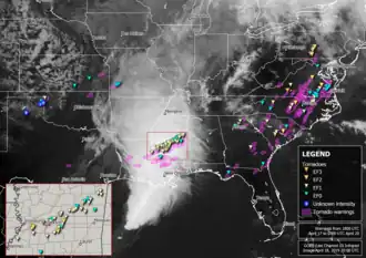 ![]() Map of tornado warnings, confirmed tornadoes, and wind reports from the outbreak with infrared satellite imagery of the storm system from the evening of April 18 | |