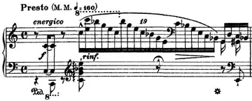 The piece begins with low octave Cs, followed by a downward run made up of an arpeggiated C7 chord. A furious set of impetuous notes then climb chromatically, and it returns to the octaved Cs and the downward run. The furious set of notes climbs even higher and a set of loud chords blare in fff. The left hand then plays loud, low pitched trills in succession. After that, the right hand plays some intense arpeggiated figures, closing with a final chord. This étude is one of the less difficult to play along with Transcendental Étude No. 3 (Paysage).[1]