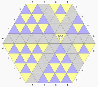 The starting setup is as shown. As in chess, White moves first, and the object is checkmate. Other standard conventions apply as well, including castling, the pawn's initial two-step move, the en passant capture, and promotion at the last rank. The triangular geometry, however, implies special move patterns for the pieces.