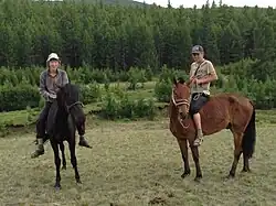 Horses are mainly ridden, as the Tuvan people are horse riders.[4] They ride horses to raise livestock, especially sheep.[13] Mares are used for their milk, and their meat is consumed locally. The Upper Yenisei horse is also bred for its meat,[3] and is mainly used as a horse-drawn vehicle and for harness farming.[8][12] The Tuvan people practice hippophagy, and the consumption of horses is ritualized and associated with a symbolic meaning that leads to the consumption of the animal considered most valuable.[14]