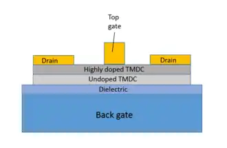 Proposed TMDC-based high-electron-mobility transistor device with top-gated Schottky contact and TMDC layers with different doping levels.[36]