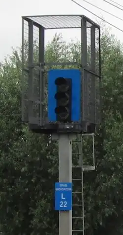 A SPAD indicator[36] is a separate indicator which may be positioned after a main signal where there is a likelihood of a serious collision at a junction if a SPAD (signal passed at danger) occurs at the main signal. They are normally unlit but following a SPAD they display a steady red light between two flashing red lights arranged vertically.[37] Any driver who sees a SPAD indicator illuminated must stop their train immediately and subsequently contact the signaller for further instructions, even if they can see that the signal pertaining to their line is showing a proceed aspect. SPAD indicators are mounted against a blue backplate or surround to prevent confusion with a failed signal, as SPAD indicators are unlit.[37] Initial testing of SPAD indicators occurred in 1994, with the current design being installed in 1996.[37] Advances in train protection systems, especially decision to install Train Protection & Warning System in response to The Railway Safety Regulations 1999, has rendered the SPAD indicator largely obsolete.[37][38]