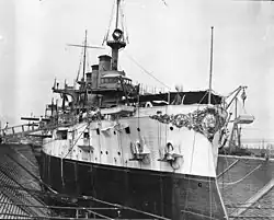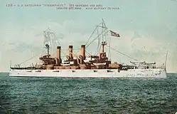 Following her return from the world cruise, Connecticut continued to serve as flagship of the Atlantic Fleet, interrupted only by a March 1909 overhaul at the New York Navy Yard.[56] After rejoining the fleet, she cruised the East Coast from her base at Norfolk, Virginia. For the rest of 1909, the battleship conducted training and participated in ceremonial observances, such as the Hudson–Fulton Celebration.[6][57] In early January 1910, Connecticut left for Cuban waters and stayed there until late March when she returned to New York for a refit.[58] After several months conducting maneuvers and battle practice off the New England coast, she left for Europe on 2 November to go on a midshipman training cruise.[58] She arrived in Portland, England on 15 November and was present during the 1 December birthday celebration of Queen Alexandra, the queen mother. Connecticut next visited Cherbourg, France, where she welcomed visitors from the town and also hosted commander-in-chief of the French Navy Vice-Amiral Laurent Marin-Darbel, and a delegation of his officers. While there, a boat crew from Connecticut engaged a crew from the French battleship Charles Martel in a rowing race; Connecticut's crew won by twelve lengths. Connecticut departed French waters for Guantánamo Bay, Cuba, on 30 December,[59] and stayed there until 17 March, when she departed for Hampton Roads.[60]