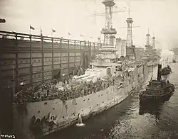 In September 1918, she was reassigned as a convoy escort; her first operation covered a convoy to Halifax on the 25th of the month. This duty did not last long, as the Germans signed the Armistice that ended the war on 11 November. Louisiana was then used to transport American soldiers back from France, starting on 24 December.[3] The first trip was made in company with New Hampshire, and arrived in Brest, France on 5 January 1919. Between the two of them, they carried 2,169 men back to the United States.[11] She made three additional trips to Brest in this role. After this task ended, she was transferred to the Philadelphia Navy Yard, where she was decommissioned on 20 October 1920. The ship was eventually sold for scrap on 1 November 1923.[3]
