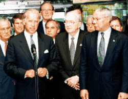 Biden voted against authorization for the Gulf War in 1991,[98] siding with 45 of the 55 Democratic senators; he said the U.S. was bearing almost all the burden in the anti-Iraq coalition.[101]
