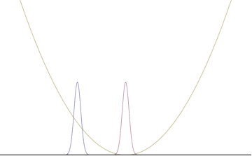 Position (blue) and momentum (red) probability densities for an initial Gaussian distribution. From top to bottom, the animations show the cases Ω = ω, Ω = 2ω, and Ω = ω/2. Note the tradeoff between the widths of the distributions.