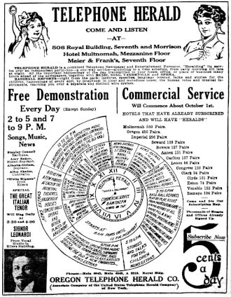Although less well known than the New Jersey affiliate, the second Telephone Herald company to implement an ongoing telephone newspaper service was the Oregon Telephone Herald Company. But like its predecessor, it also soon faced financial difficulties and was short-lived. The company was incorporated in Oregon, and headquartered at 506 Royal Building (Seventh and Morrison) in Portland. Extensive demonstrations were begun in May 1912, and advertisements the next month said commercial service would start "around October 1st".[21]