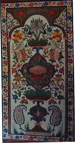 Later works of Karabakhi, saving a mastery of ancient decorative paintings, are distinguished for growth of realistic features in interpretation of distinct graphic motifs. A picture drawn by him in the house of Mehmandarov in Shusha city, where images of deer and pomegranate tree are distinguished for their free interpretation and sappiness of forms, is the most famous picture of the artist. The artist created on the basis of both earlier developed canonized schemes and immediate observations.[8]