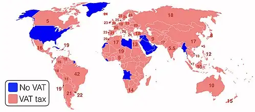Products exported to other countries are typically exempted from the tax, typically via a rebate to the exporter. VAT is usually implemented as a destination-based tax, where the tax rate is based on the location of the customer. VAT raises about a fifth of total tax revenues worldwide and among the members of the Organisation for Economic Co-operation and Development (OECD).[1]: 14 As of January 2025, 175[2] of the 193 countries with UN membership employ a VAT, including all OECD members except the United States.[1]: 14