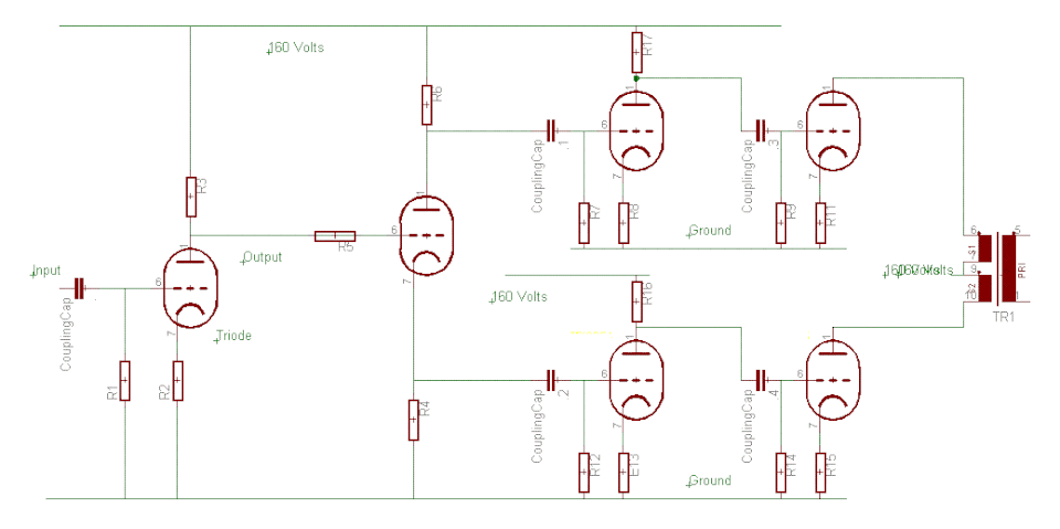 The following circuits are simplified conceptual circuits only, real world circuits also require a smoothed or regulated power supply, heater for the filaments (the details depending on if the selected valve types are directly or indirectly heated), and the cathode resistors are often bypassed, etc.