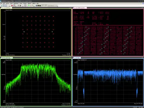 Typical vector signal analyzer displays feature the spectrum of the signal measured within the IF bandwidth, a constellation diagram of the demodulated signal, error vector magnitude measurements, and a time-domain plot of the signal. Many more measurement results can be displayed depending on the type of modulation being used (symbol decoding, MIMO measurements, radio frame summary, etc.).