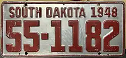 1948 | Embossed red on unpainted aluminum with border line; "SOUTH DAKOTA 1948" at top | none | 1-1234 10-1234 |