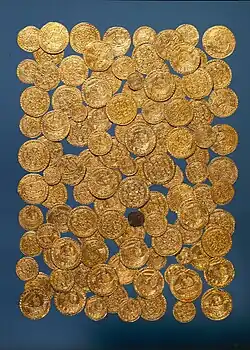 The Vejby Treasure (Danish: Vejbyskatten), also known as the Vejby Beach Treasure (Danish: Vejby Strand Skatten), is a treasure trove discovered in 1976 on shallow water off the north coast of Zealand at Vejby Beach, Gribskov Municipality, some 60 km north of Copenhagen, Denmark. It consists of 110 gold coins and a single copper coin. 109 of the gold coins are English nobles and one is a Lübeck guilder. It comes from a cog which wrecked at the site some time between 1377 and 1380 on its way to the Baltic Sea or the Skåne Markets for trade. It is now on display in the National Museum of Denmark.