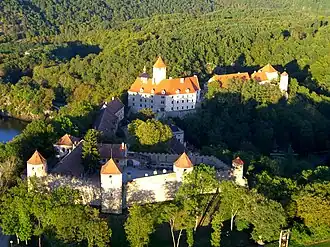 Veveří (Czech: hrad Veveří, German: Eichhorn) is an originally ducal and royal castle in Brno in the Czech Republic. It is located about 12 kilometres (7 mi) northwest of Brno city centre on the Svratka River.