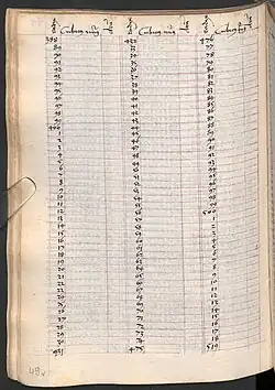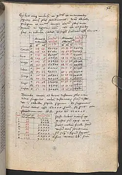 Apart from canons and diagrams, Vienna ÖNB 5203 also contains a number of astronomical tables. For instance, the canon at folios 54r-58v starting "Cum diu saepe dubitarem an tabella que Solis altitudines ad horam…"[14] and entitled Compositio tabule altitudinis Solis ad omnes horas is accompanied by tables that are integrated directly in the texts[1] (in comparison to a common tradition of separating canons and tables within the manuscript, or sometimes even within two different manuscripts).