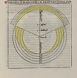 As many of the manuscripts of the Alfonsine corpus, Vienna ÖNB 5203 contains a work of one of the key figures of the Alfonsine period—John of Murs.[12] However, the choice of the work is rather original, as it touches upon the musical subject. John of Murs’ treatise Musica speculativa (also known under the title Musica speculativa secundum Boetium) is situated on folios 129r-133r. This work was written in and is in a certain way a summary of Boethius' musical treatise for studying purposes.[13] The layout of folios 129r-133r is different from the rest of the manuscript, as Regiomontanus has left noticeably smaller margins in comparison with those observed in Theoricae Novae Planetarum.[10] However, the treatise is also accompanied by a number of marginal annotations, which is not surprising, as it has been used a lot for the university teaching, and thus was annotated in various manuscripts.