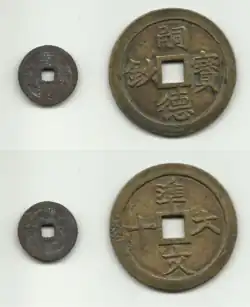 The Vietnamese term văn (文) would appear on the Thành Thái Thông Bảo (成泰通寶), Duy Tân Thông Bảo (維新通寶), and Bảo Đại Thông Bảo (保大通寶) cash coins produced under French rule, the last of these was officially produced until 1945.[6][7]