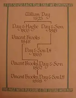 Vincent Brooks had started negotiating to take over the business of Day & Son Ltd during 1866.[20] Financially assisted by the Henry Graves, the Printseller of Pall Mall,[2] Vincent Brooks bought their property, name, and goodwill in an agreement dated 25 March 1867.[21] The firm now became known as Vincent Brooks, Day & Son.[20]