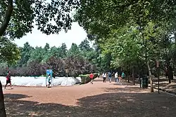 The park has an extension of 38.9 hectares,[2] located in the far west of the Coyoacán borough next to Ciudad Universitaria .[3] From its initial creation by Miguel Angel de Quevedo, the area has operated primarily as a tree nursery, growing seedlings for reforestation projects. The nursery operation produces about one million seedlings per year, which are mostly planted in and around Mexico City.[3][4] Most of the park's area is planted with trees, and it is considered to be one of Mexico City's “lungs.” Other areas are dedicated to seed beds, orchards and greenhouses.[3][5] The area used to be part of a ranch called Panzacola, and a few remains of this can still be seen such as the ruins of a small rectangular chapel and a well, with a date marking of November 18, 1918.[3]