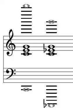 Vogel claims that his formula entails also compositional consequences. If one wants a chord to be consonant, major chords should be composed such that thirds and sevenths are set in a high register. Minor chords, however, would have to be set the other way round, with thirds and sevenths being set in a low register. This is by no means compatible with the compositional practice of the last centuries (with perhaps the exception of the Tristan chord, see below). In consequence, minor chords set along Vogel's composition rules sound unfamiliar. They exhibit, however, a better congruency of harmonics than their classical variants. The left-hand of the two C minor chords in the adjoining figure is composed in the classical way, with the third being set in a high register. The consonance value for this chord is 4.33. The right-hand minor chord features a low third. It sounds unfamiliar. Its consonance value is, however, much lower (3.0), and the congruency of its harmonics is much better.
