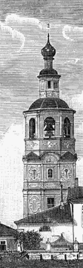 The first wooden church was built on 18 October 1654, following the Russian tradition of 'one-day' churches. Such buildings were constructed in one single day by all of the citizens, and thus thought to be pure from evil and disease. The church in Vologda was aimed to free the city from the plague outbreak, which lasted for seven weeks and took many lives. When the church was finished, the plague stopped.[3] Amazed by this, the citizens asked a local icon painter to create an icon in gratitude of God's mercy. The icon was also created in one day and became the most important relic in the city.[4][1]