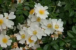 During the Second World War Wilhelm Kordes II crossed the East Asian Rosa wichurana with the Japanese Rosa rugosa eventually to obtain a new species, Rosa kordesii, able to withstand the harsh winters of north Germany. From it he later bred such famous post-war varieties as 'Parkdirektor Riggers,' 'Leverkusen,' Hamburger Phönix' and 'Heidelberg.' "The dark, glossy foliage of many modern roses can be traced back to 'Kordesii'."[1]