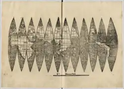 The map is drafted on a modification of Ptolemy's second projection, expanded to accommodate the Americas and the high latitudes.[3] A single copy of the map survives, presently housed at the Library of Congress in Washington, D.C.