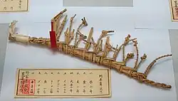 Warazan (藁算) was a system of record-keeping using knotted straw at the time of the Ryūkyū Kingdom.[3][4] In the Southern Ryukyuan languages of the Sakishima Islands it was known as barazan and on Okinawa Island as warazani or warazai.[5] Formerly used in particular in relation to the "head tax", it is still to be found in connection with the annual Itoman Giant Tug-of-War (糸満大綱引), to record the amount of miki or sacred sake dedicated.[1]