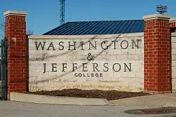 The campus of Washington & Jefferson College is located in the city of Washington and the East Washington Borough, small-town communities about 30 miles (48 km) south of Pittsburgh.[40][41] The 60-acre (24 ha) campus is home to more than 40 academic, administrative, recreational, and residential buildings.[40] The northern edge of campus is bound by East Walnut Street, the western edge by South College Street, the southern edge by East Maiden Street, and the eastern edge by South Wade.[42] Portions of the campus extend into the East Washington Historic District.[43] Four historic gates mark four traditional entrances to campus at East Maiden Street, Wheeling Street, South College Street, and Beau Street.[44] In 1947, the Pennsylvania Historical and Museum Commission installed a historical marker noting the historic importance of the college.[45]