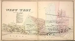 The location of the future city was taken by the village of Gibbonsville (1824) and its successor West Troy, and the hamlet of Washington (later Port Schuyler).[7] The farm owned by John Bleeker, stretching north from Buffalo Street (Broadway and 15th Street) to the farm owned by the Oothout family near 25th Street was purchased by Philip Schuyler, Isais Warren, Richard P. Hart, Nathan Warren, and others in 1823; they named it West Troy. Gibbonsville was the farm of James Gibbons (which he purchased in 1805), which stretched from North Street (8th Street) to Buffalo Street (15th Street).[6] Washington was settled sometime before 1814 and was the area south of Gibbonsville and today the area of Watervliet south of the Arsenal; it became known as Port Schuyler in 1827.[7] Although Gibbonsville and West Troy sat side by side (West Troy lying on Gibbonsville's northern boundary), there was a rivalry between the two and each named and laid out their streets with no regard to the street names and grids of the other.[7] In 1824 Gibbonsville became incorporated as a village, and in 1836 this was repealed when West Troy became incorporated as a village including Gibbonsville and Port Schuyler;[7] and in 1847 the Watervliet post office changed its name to West Troy.[8] In 1830, Gibbonsville had 559 people, West Troy 510, and Port Schuyler 450.[8]